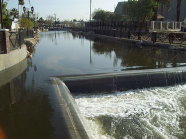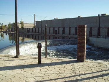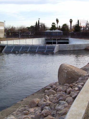 The weir structure at California Avenue is an 85-foot long circular arc. The weir was also built during the three week construction schedule in December of 2008 when the Canal was closed for maintenance. The weir structure consists of 8 precast panels in conjunction with two panels used for the gated intake structure. Each panel has an 8'-0" wide by 12" high base. The two anchor panels have walls of 11'-4" wide by 10'-6" high. The six remaining panels are each 10'-6" wide by 10'-6" high. The intake structure is more than 32' x 18' in size, and works in combination with the weir's slide gates and bypass gate opening to control water flow and regulate canal water levels along the southern portion of the Mill Creek Linear Park.